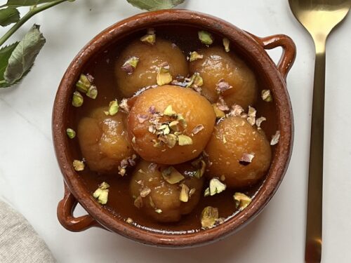 Creamy cheesecake infused with the flavors of gulab jamun, topped with syrup-soaked dumplings for a fusion delight.